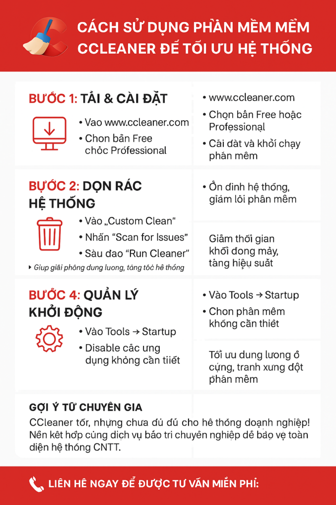 Trong môi trường làm việc hiện đại, hiệu suất của máy tính là yếu tố quan trọng ảnh hưởng trực tiếp đến năng suất làm việc của doanh nghiệp. Một trong những phần mềm được sử dụng phổ biến nhất để dọn rác và tối ưu hệ thống Windows là CCleaner. Với vài thao tác đơn giản, bạn có thể cải thiện tốc độ máy tính, giải phóng bộ nhớ và giảm thiểu lỗi phần mềm.